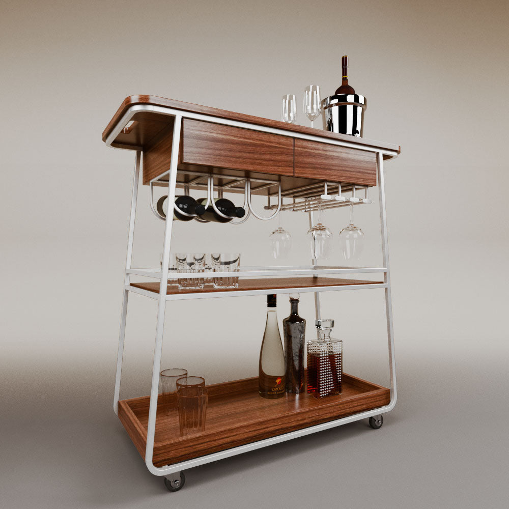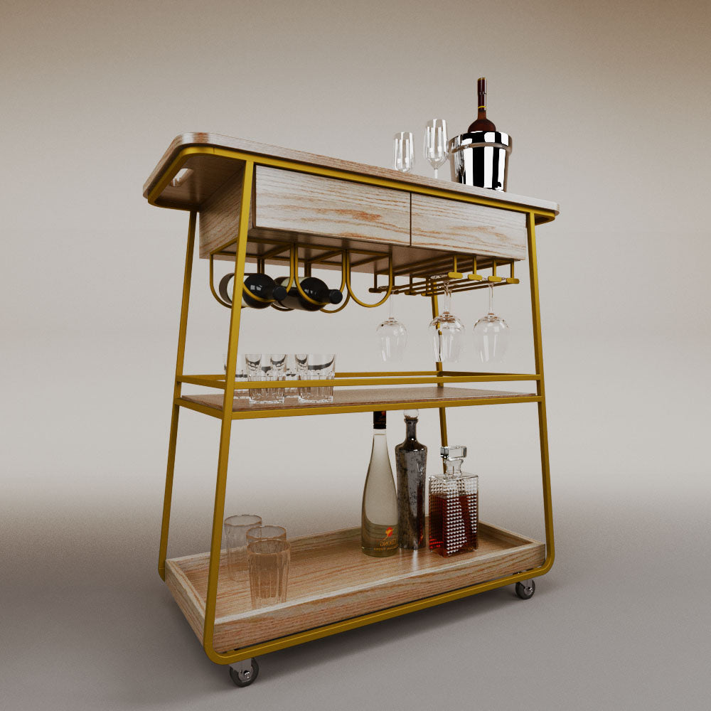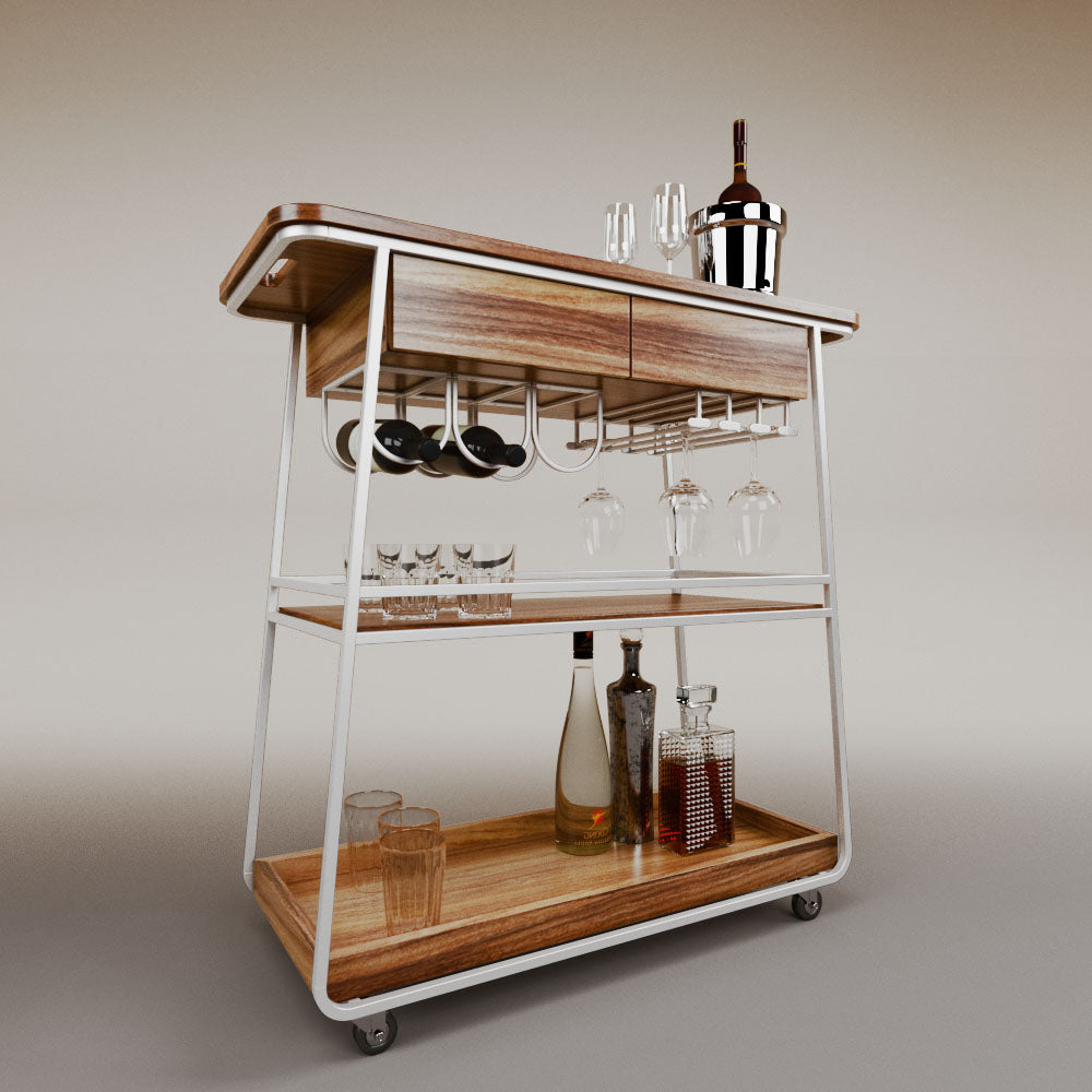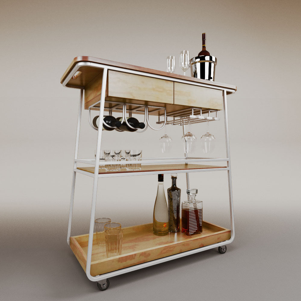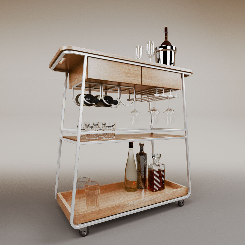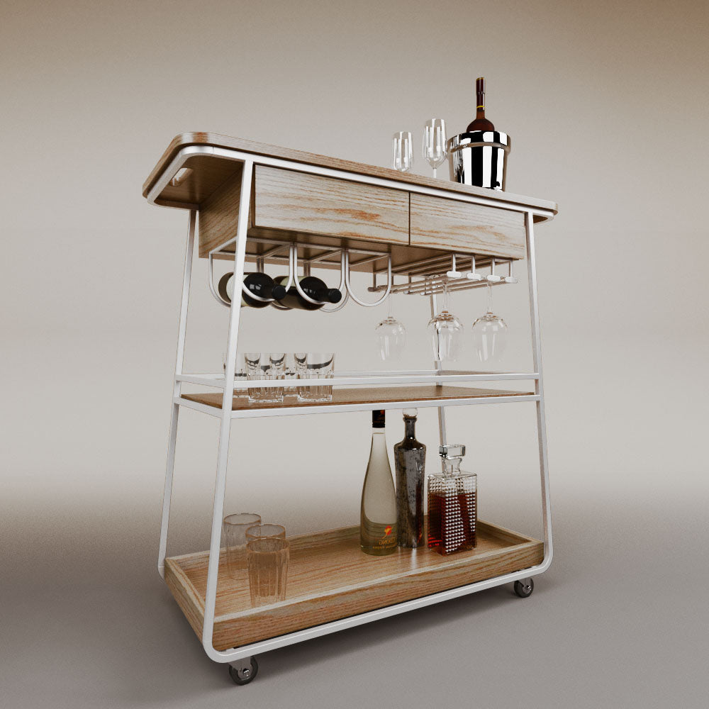 It has 2 drawers, 1 wooden tray and 1 tempered glass shelf.