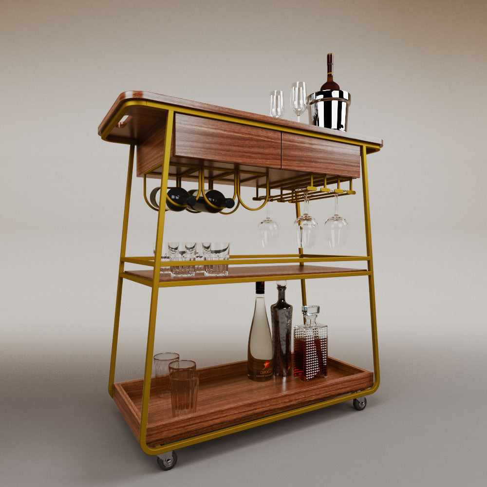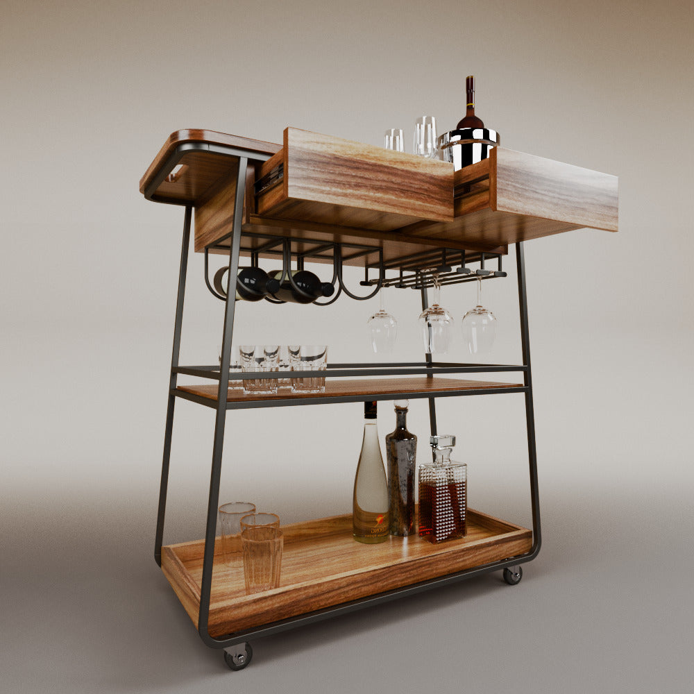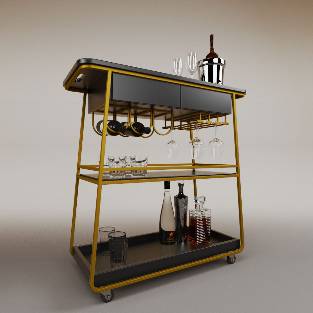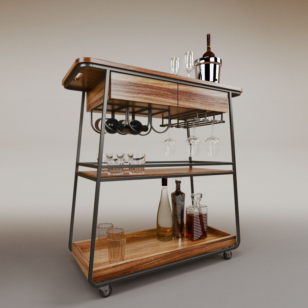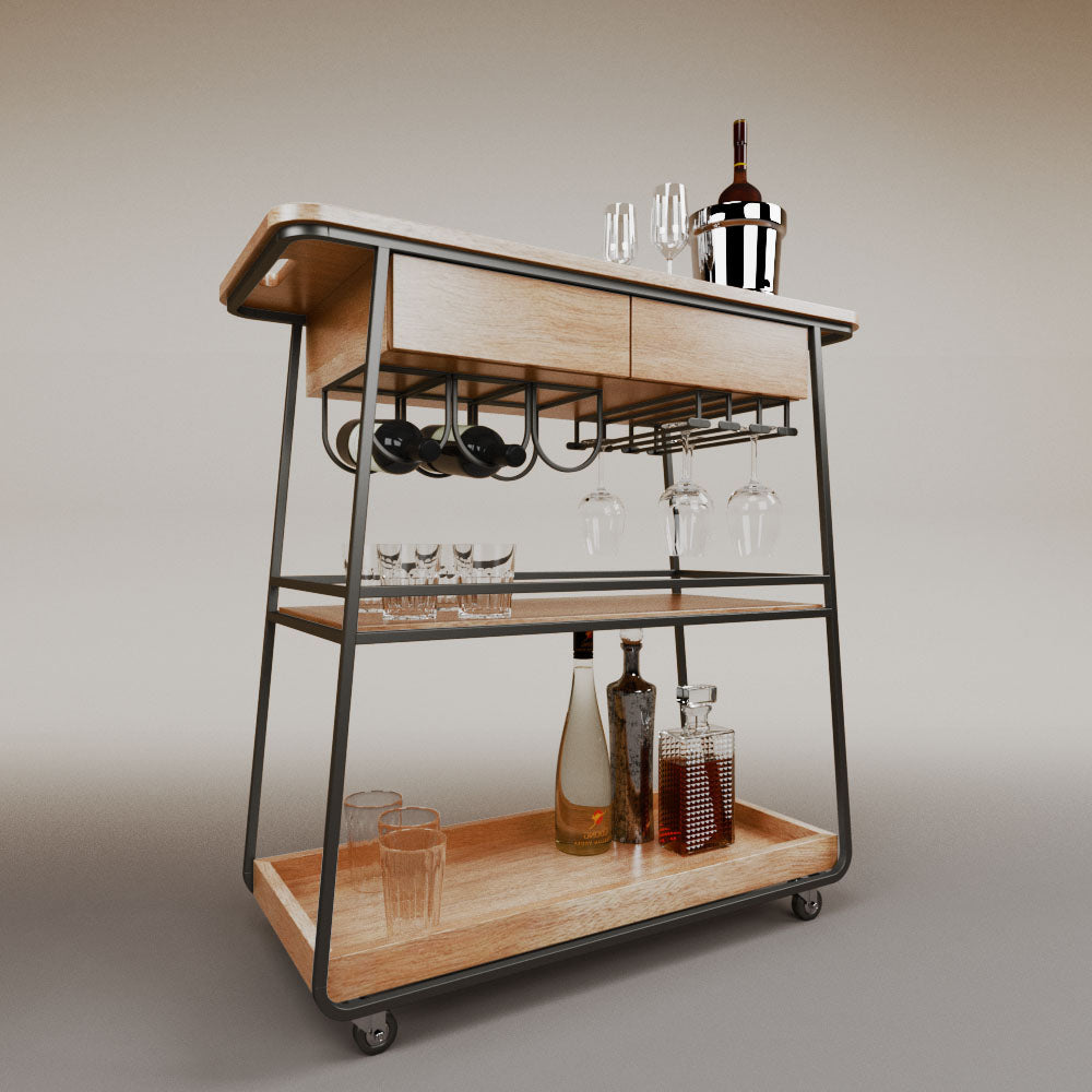 It has 2 drawers, 1 wooden tray and 1 tempered glass shelf.