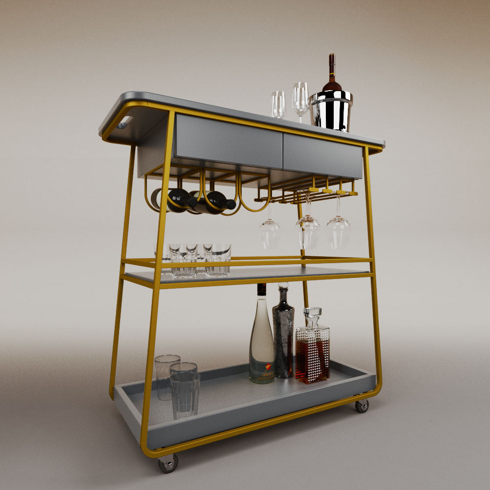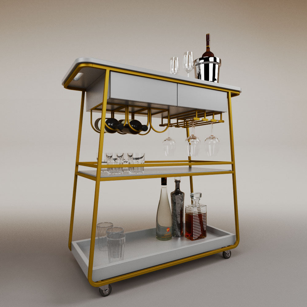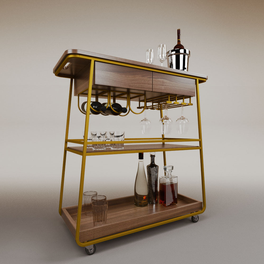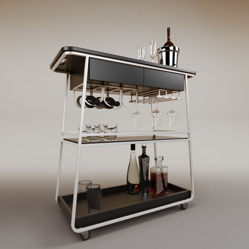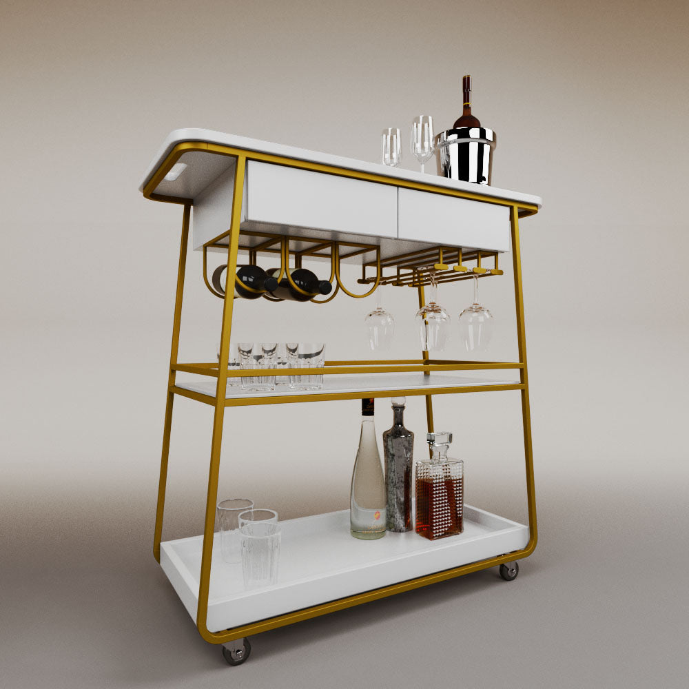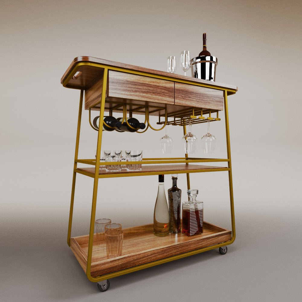 It has 2 drawers, 1 wooden tray and 1 tempered glass shelf.