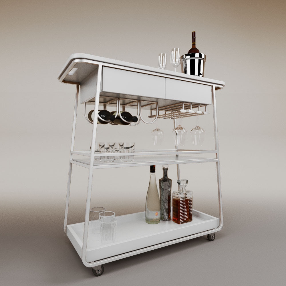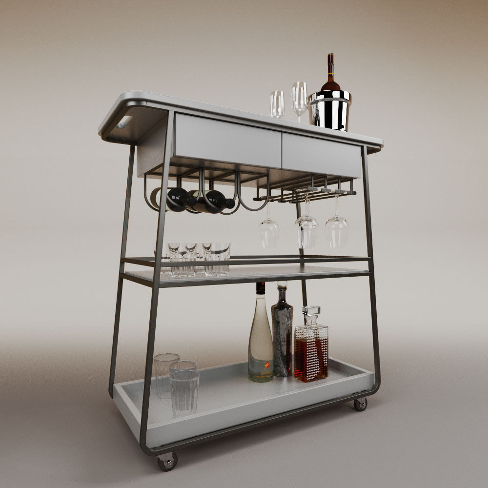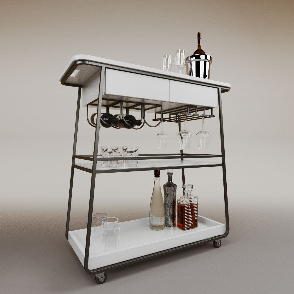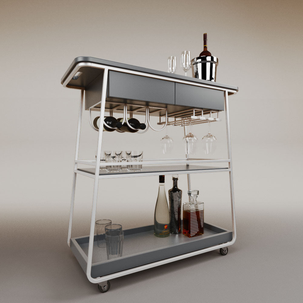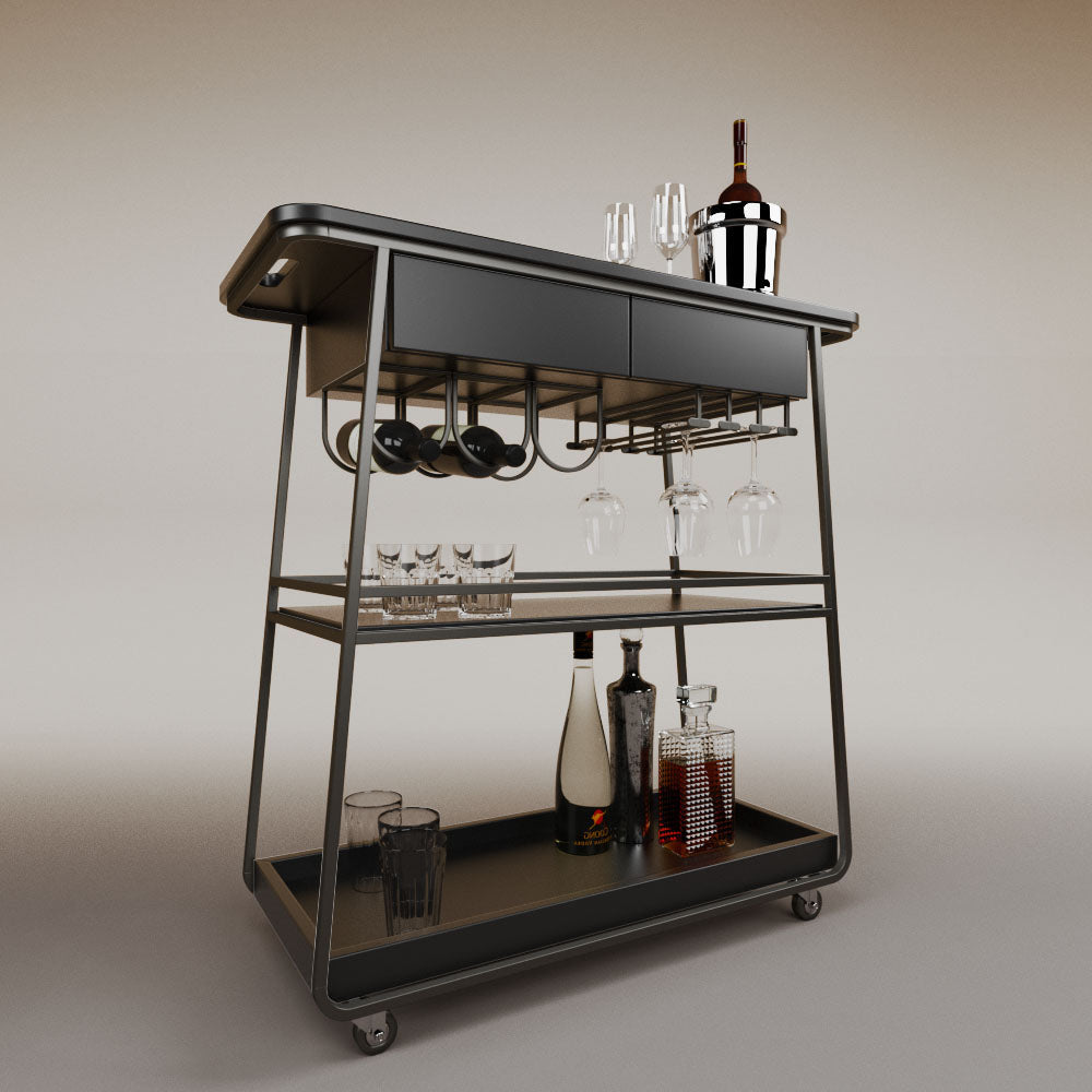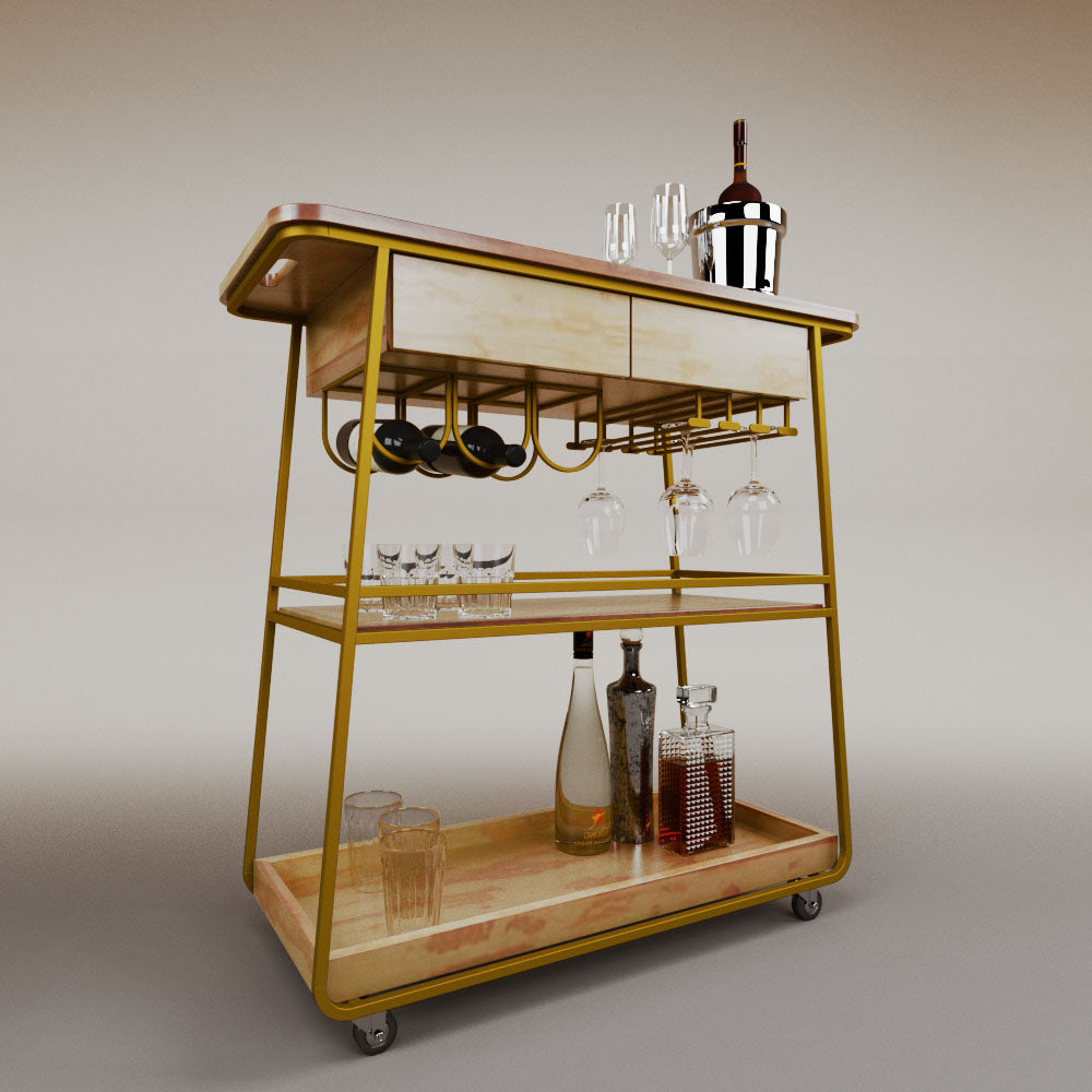 It has 2 drawers, 1 wooden tray and 1 tempered glass shelf.