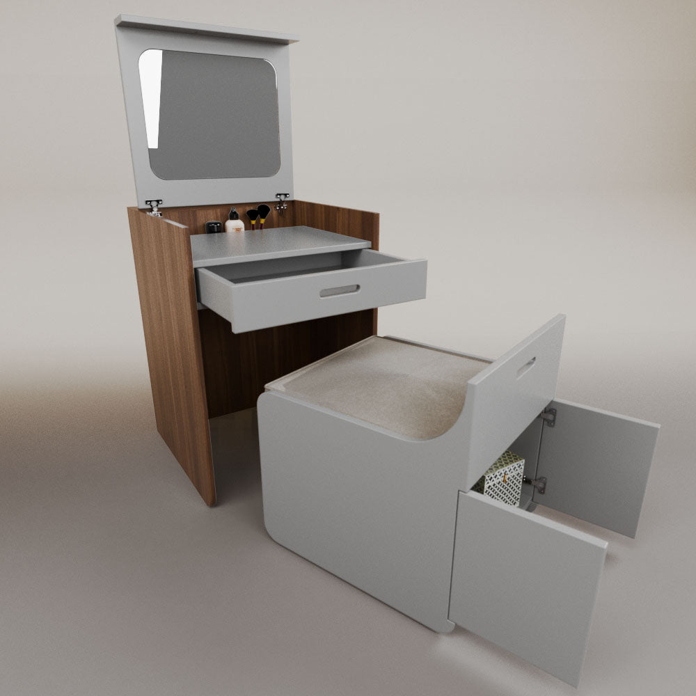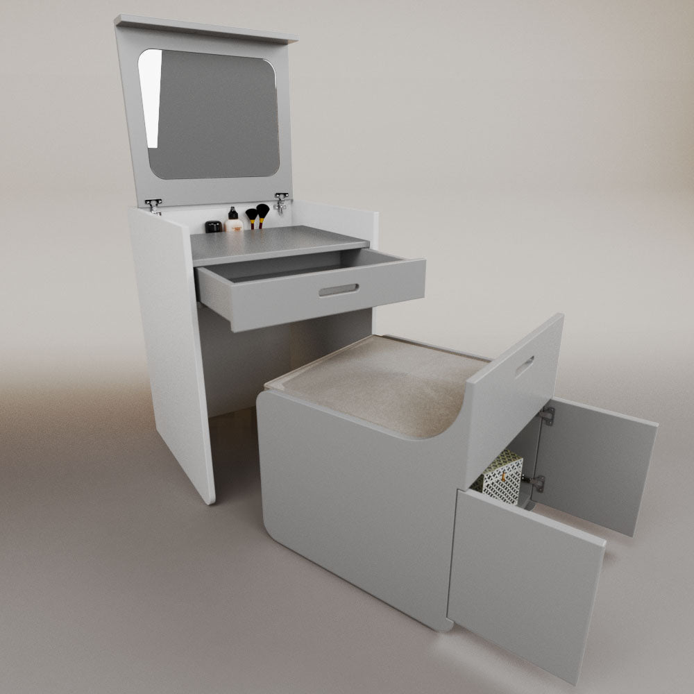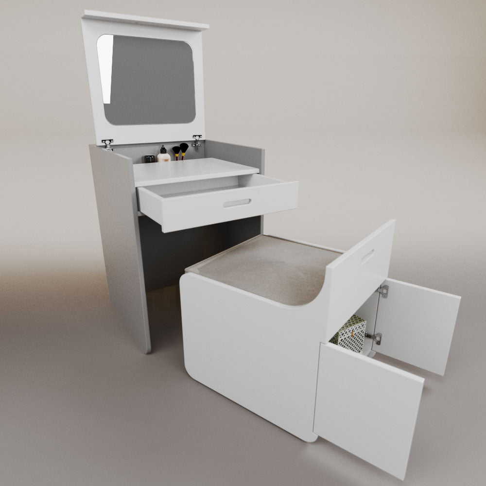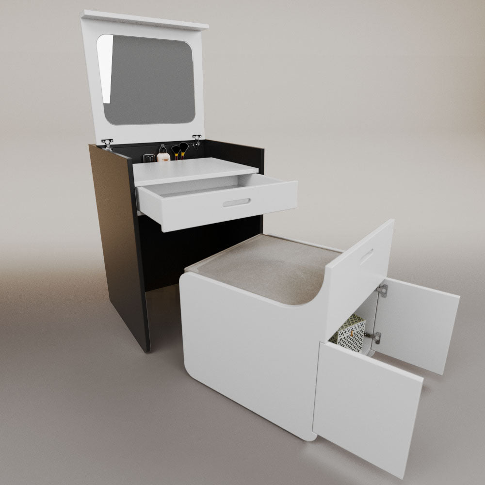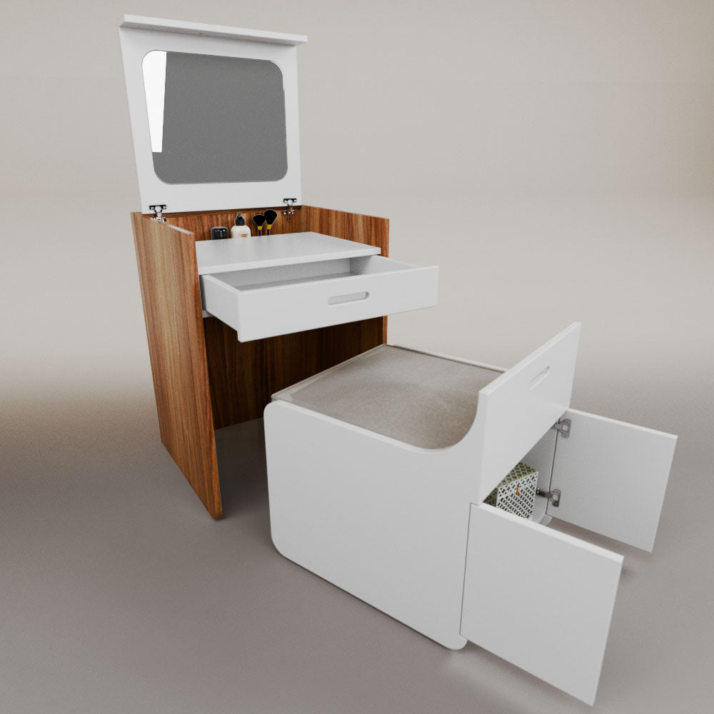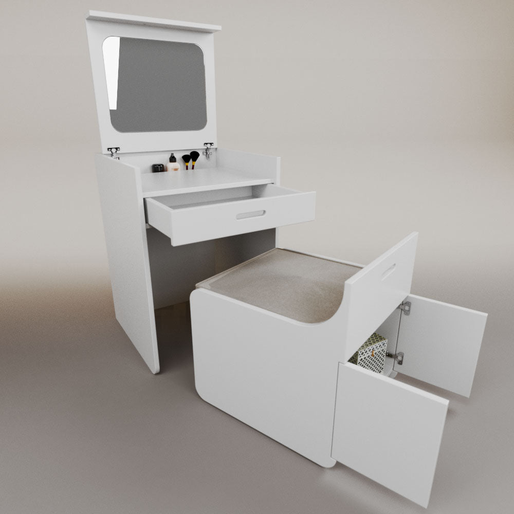 1 tapa abatible1 charola1 espejo1 cajón1 banca1 nicho cerrado1 cojín_______________________________60 x 60 x 84 (L x An x Al)_______________________________Entrega de 5-8 semanasGarantía 1 añoEnvío gratuito en CDMX